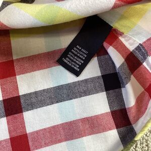 Phat Farm short sleeve button-up shirt featuring a bold multicolor plaid pattern in red, yellow, black, and white. Tag reads Men’s Large, but based on flat measurements, this fits more like a Youth XL or Men’s Small. Features two chest pockets with button flaps and embroidered Phat Farm logo. Made from 100% cotton—lightweight and perfect for casual wear.