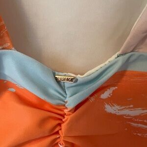 Brand new with tags Phax stylish one-piece swimsuit featuring vibrant orange, blue, and white patterns. Adjustable tie straps for a perfect fit. fully lined, scrunch butt