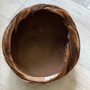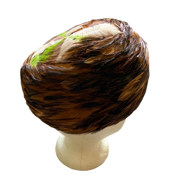 Vintage Pheasant Feather Felt Hat Wire Support. Brown feathers around hat. Beautiful ivory green and brown feathers on top of hat. Union made in USA. JK 824B00. Pillbox style.