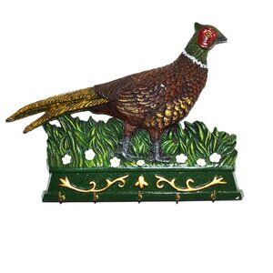 Great for home with outdoor decor, camp, or use as leash holder for bird dogs. Holder with pheasant on top. Has 5 hooks for hanging items. Wall hanging hook in back.