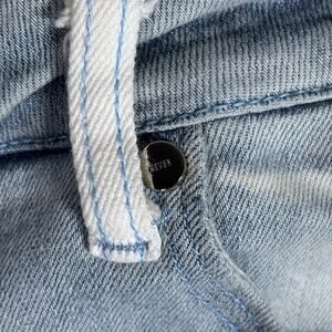 • Details: Embroidered lettering down legs, raw hem, stretch denim