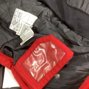 This jacket is in great condition! A couple of light marks from use, but no major stains, no tears, no holes. Crimson red with accents of gray, reflective strips, and the inside in black. It is polyester from the outside to the lining to the insulation, with a small amount of acrylic. Detachable hood, insulated Thunderon Digenite Thermo, with lots of pockets, inside and out, including a waist-length pocket in the back. Vents under the arms. Men's size XL. Please note measurements below to ensure exact fit.