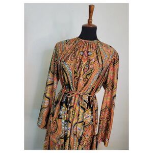 Phenomenal 1960's Abstract Paisley Dress. By Ann Murray. Long Sleeve mid length with tie waist. Tie can be removed for more free fit. Zip back and two front pockets. Black background with colorful ornate paisley design in gold, red, blue and green. No size or material tag. Material has a silky feel... maybe rayon or poly. Chest measures 27" across flat. Waist measures 28" across flat. Hips measure 28" across flat. Length from shoulder to hem measures 48". Fits medium best. Beautiful vintage condition with no discolorations or flaws.