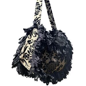 Pheobe & Josephine Velvet Jacquard Floral Mink Flap Tassl Fringe Carpet Bag