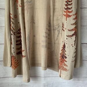Beige open front cardigan with printed tree pattern by Phil Love. This long-sleeved cardigan has orange, brown, and cream ombre trees on the front and back. It is a lightweight, thin material. It is pre-owned, with one small snag on the back, but otherwise in good condition.