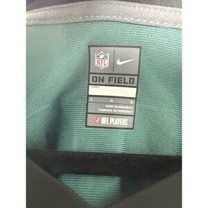 The product is a Philadelphia Eagles Jalen Hurts #1 Midnight Green Jersey in size Large, officially licensed by Nike. This football jersey represents the Philadelphia Eagles, a team in the National Football League (NFL). Designed for men, this jersey in green color is perfect for fans to wear during the pre- and post-season games. With the player's name and number on the back, it is a must-have for any Eagles supporter wanting to show their team pride.