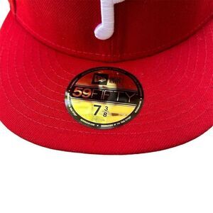 Keywords: New Era, fitted cap, Philadelphia Phillies, red cap, men's hat, baseball cap, sports fan, casual wear, spring fashion, embroidered logo, durable construction, high-quality materials, twill fabric, officially licensed, size 7 3/8.