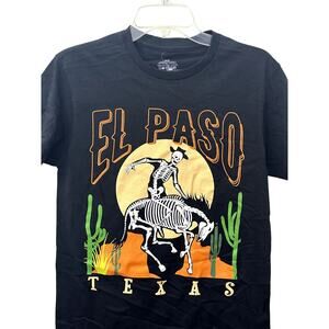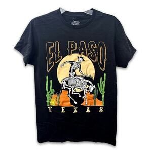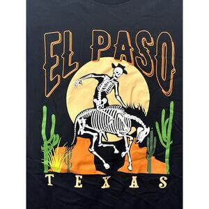 This Philcos graphic T-shirt features a bold "El Paso" skeleton design against a desert-inspired backdrop. Made from 100% cotton, it offers breathable comfort and a relaxed fit. Perfect for casual outings or adding a touch of edgy style to your wardrobe.