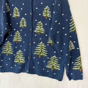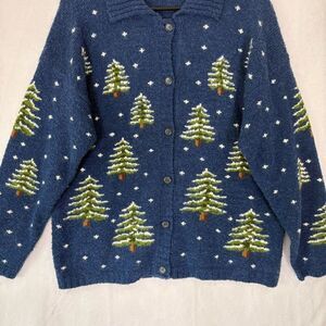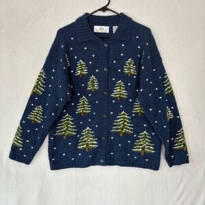 Excellent condition Design Options Philip & Jane Gordon Blue w/ Snowy Pine Tree Button Up Collared Cardigan Sweater