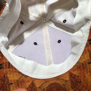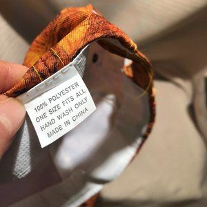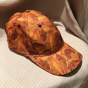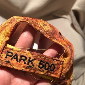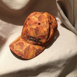 Philip Morris USA women orange with leafy print baseball cap, adjustable strap at back marked Park 500