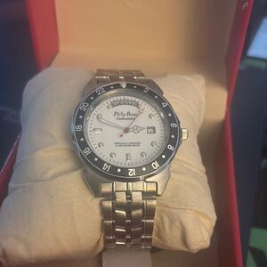 Elevate your style with this men's watch. Featuring a sleek silver design, it is perfect for any occasion. The Philip Persio Professional Watch combines classic aesthetics with everyday functionality. With a 40mm case, reliable quartz movement, and a date display, it is designed for precision and convenience. Boasting 3ATM water resistance, it can withstand daily splashes and brief water exposure. Ideal for both work and casual wear, this timepiece offers a sophisticated, professional look at an affordable price.