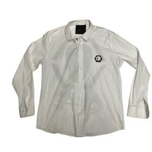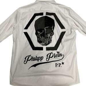 Philip Plein Men's White Button Down With Jeweled Skull Graphic Size XXL