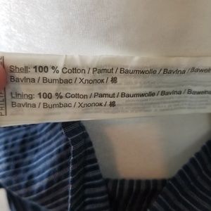 Jacket is XS. shell 100% cotton Lining 100% cotton