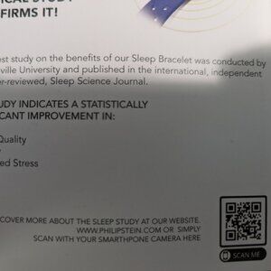 Philip Stein Natural Frequency Sleep Bracelet - proven in study to show improved cognitive function, sleep quality, and reduced stress. This bracelet was only worn once. Includes beige and black suede bands. Only worn once - band was too small. Included band carry case, carrying pouch with sleep mask, and original case. Click on the QR code in the pictures to learn more