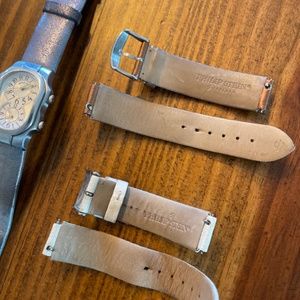 Beautiful Philip Stein women’s watch featuring the signature double face. Genuine leather luster watch band is brand new with tag. Rust colored genuine leather band is also brand new but missing it’s loop. White genuine leather band is used with wear - but wear unseen while watch is being worn.