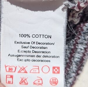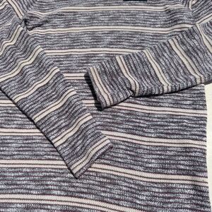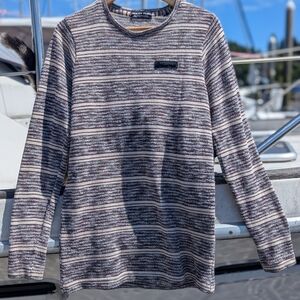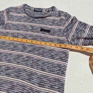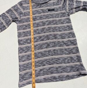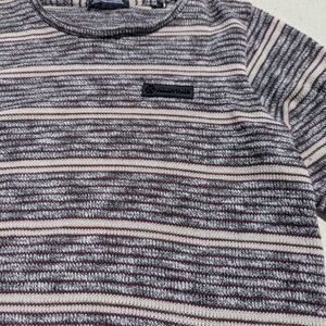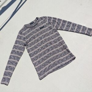 Vintage striped crew neck sweater with logo patch from Phillip Plien. Cotton. Marled black and white with deep purple/plum contrasting stripes. Knit. Mid-weight.