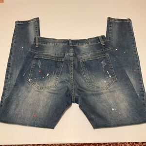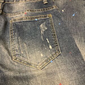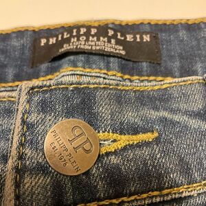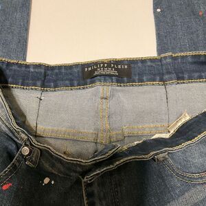 Philipp Plein Men’s Paint Splatter Distressed Jeans. 5 pocket. Black patches behind distressing. Professionally altered! See measurements. Slim/skinny. Off the hook luxury. Made in Switzerland. Flat lay W 14.5” L 38” R 10”, I 29.5, Ankle 5.5”