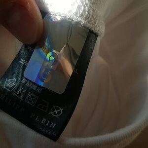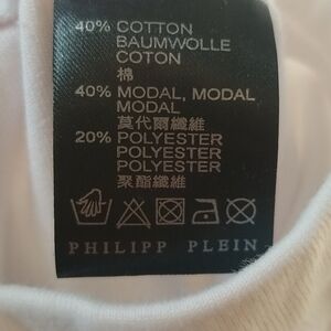 White terry sweatpants with a drawstring waist and a rhinestone skull embellishment. Features a Philipp Plein plaque on the back and an authenticity hologram. New without tags.