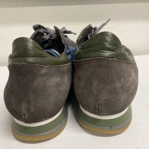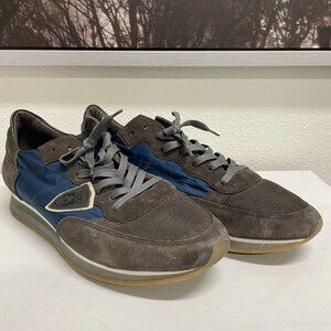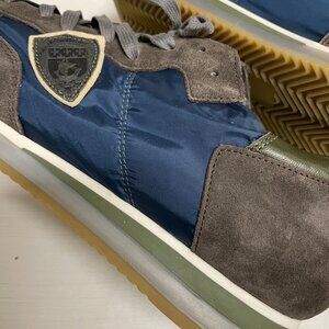 The iconic Tropez Haute style from Philippe Model has superior design. Inspired by vintage ‘70s sneakers, it has an upper in blue and olive technical fabric and milled leather for a worn effect with contrasting suede. The ultra-light rubber sole with handcrafted finish. Made in Italy, The size is 11 1/2 or size 46. Gently used, little or new visible use.