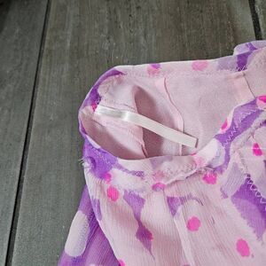 This is a pleated skirt by Philippe Adec. It has a pink and purple sheer overlay with a solid pink lining. The skiet has a zipper on the back with a hidden inner clasp.