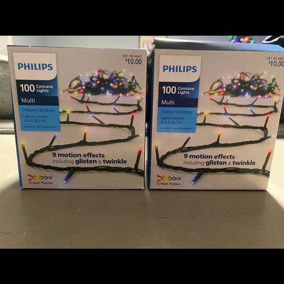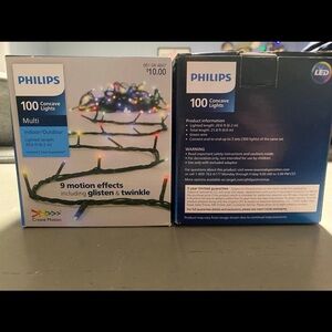 Philips LED string lights with vibrant colors. Includes 9 motion effects like glisten and twinkle. Suitable for indoor and outdoor use.