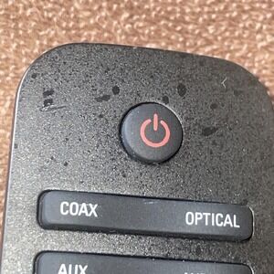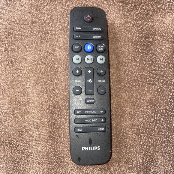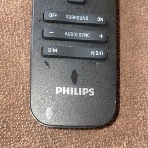 Sound bar remote for a Philips device. Battery compartment is clean. This is untested - I have nothing to test it against. The remote is clean. There is spotting on the front of the remote and one button has minor rubber missing (see pics).