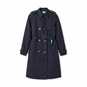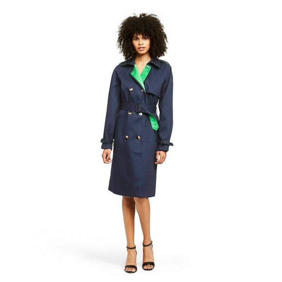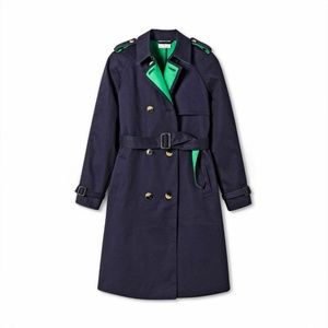 Simply sophisticated style gets a refreshing pop of color for a modern take on the Long-Sleeve Button-Down Trench Coat from 3.1 Phillip Lim for Target. This long-sleeve trench coat comes in solid navy for a classically chic look, and it gets the perfect touch of vibrancy from green lining within the coat as well as the reverse of the belt, collar and epaulettes. 100% cotton fabric provides you with all-day comfort, and you'll stay shielded from the elements, thanks to a rain flap.