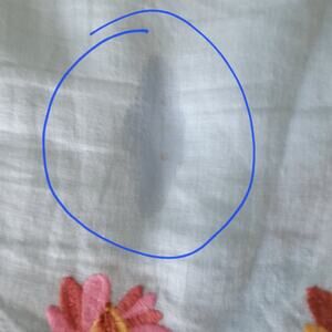 The dress is in great condition except for 2 tiny spots, one in the button, hem at the back, and one in the bow at the sleeves. I have highlighted these flaws in the pictures. I am pretty sure it will go away it spot clean with a tide marker.