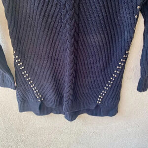 Black in color. Chunk knit 100% cotton material. Decorative stud embellishments along shoulders and waist. Round neckline with long sleeves. Hit at the waist, hi-low hemline.