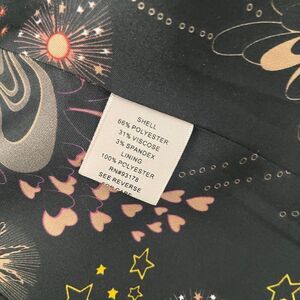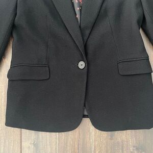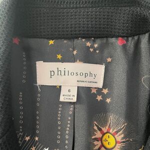 Philosophy Black One Button Printed Lining Oversized Blazer. Faux front pockets. Lining is printed with moon sun hearts and stars design. Size 6.