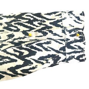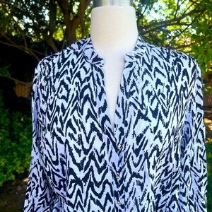 This elegant Philosophy blouse features a wrap style in a striking black & White complemented by a mandarin collar for a sophisticated touch. The blouse's flowing silhouette and lightweight fabric make it perfect for both casual and business casual settings.( pit2pit 25” length 30” approximately)