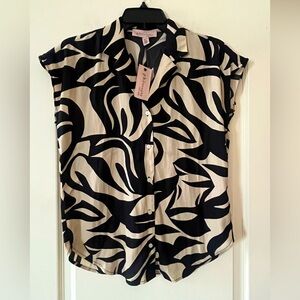 NWT New Chic button-down shirt by Philosophy. Features bold black and cream pattern. Ideal for versatile styling. Please check measurements in photos as this blouse seems to run larger than XS. Button down, polyester. Business casual. Unique style, designer. Cap sleeve. Smoke free home