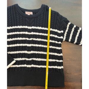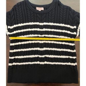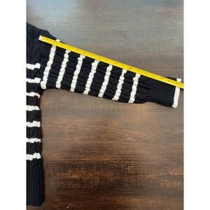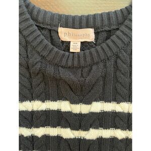 This Philosophy women’s sweater in size medium is in excellent condition, showing no signs of wear, tear, or stains. It features a classic black and white striped design with a cozy cable knit texture. The soft fabric blend ensures comfort and warmth, while the quality construction makes it durable for everyday wear. The medium fit offers a flattering silhouette that’s easy to style and comfortable to layer.