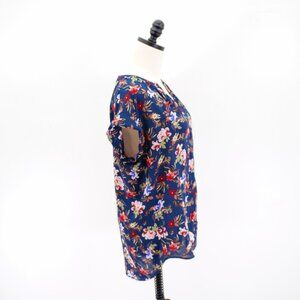Philosophy Blue Red Green Medium Sheer Lightweight Blouse Top Sleeveless V-Neck W/ 1/4 Buttons Polyester Rolled Tab Sleeve