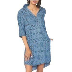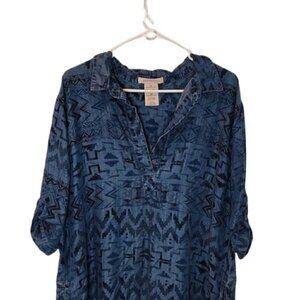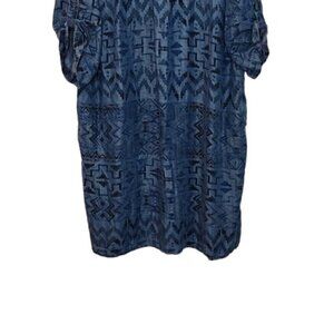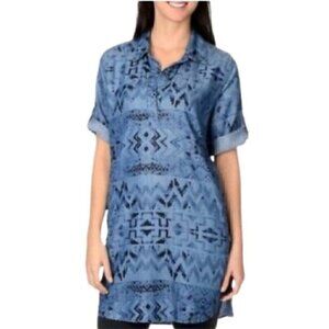 Lovely tribal printed chambray tunic shift shirtdress. Lightweight lagenlook. Button down front closure just above the bust. Short sleeves. Button tab accents on the sleeves.