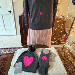 Philosophy Charcoal Heart Sweater + Hannah Rose 100% Cashmere Hat & Gloves (NWT)