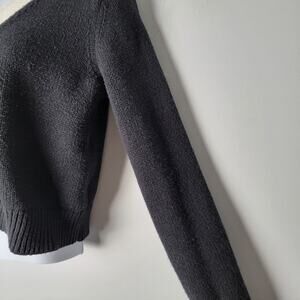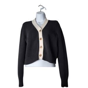 Cozy and cute cropped sweater by Philosophy in size Medium. Features a soft black knit with creamy white trim along the neckline and button front, plus tortoiseshell-style buttons for a vintage touch. Long sleeves with ribbed cuffs and hem. Gently worn and in beautiful condition. Slightly boxy silhouette with a flattering V-neckline.