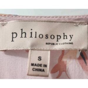 Keywords: Philosophy, Floral top, Tunic top, Ruffle hem, Blouse, Flowy top, Pink blouse, Floral blouse, Womens top, Small, S, Three quarter sleeve, Casual top, Boho top