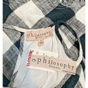 Embrace timeless elegance with the Philosophy Black & White Gingham Dress, a charming addition to your wardrobe that effortlessly combines classic style with modern finesse. The halter neckline and knee-length cut make it a versatile piece for various occasions, from business meetings to casual outings or evening cocktails. The knit linen blend fabric ensures comfort and breathability, while the lined interior provides extra coverage for a seamless look. Accented with playful fringe details, this A-line dress features a drawstring closure for an adjustable fit, making it perfect for those days when both style and ease are essential. The dress's sleeveless design and lightweight material make it ideal for layering or wearing alone during the warmer seasons of summer, spring, or fall. This garment is a testament to the chic sophistication that philosophy is known for, and it's ready to complement your personal style with its unique blend of retro and contemporary vibes.