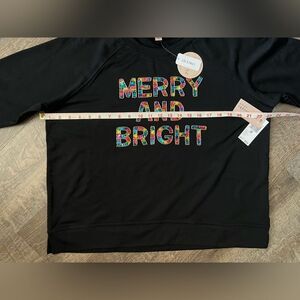 This listing is for a NWT's Philosophy Merry and Bright top and bottom set in size medium. The set is black and features " Merry and Bright" in colorful sequence on the top. The bottoms are black matching jogger pants. Please see the photos for the top and bottom measurements.
