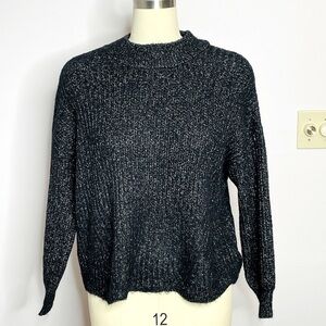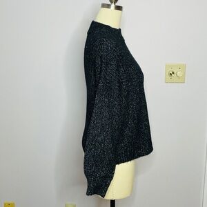 How pretty is this sweater? Mock turtleneck design. Black knit material with silver metallic thread woven in. Balloon type sleeves (cuffs are narrower than the sleeve). Ribbed cuffs. Super soft and cozy. Shorter cut. Lots of stretch! I love a neutral colored sweater that can double as a special event piece. Looks great with both skirts and jeans.