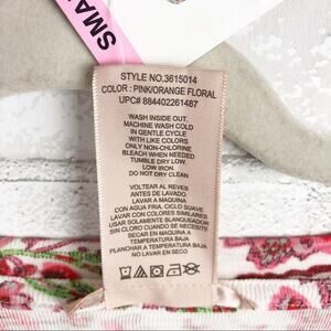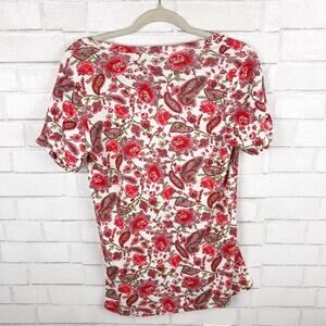 Philosophy NWT Floral Print Pima Cotton Short Sleeve V-Neck Shirt Top Size Small. Floral and paisley print design in pink/orange. Hi-Lo style with slits on the side. Step hem. Rolled sleeves. Style# 3615014.