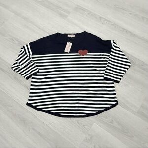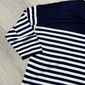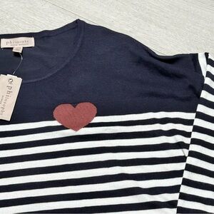 Philosophy 3/4 sleeve Chic top with navy and white stripes. Features a red accent. Ideal for casual wear.