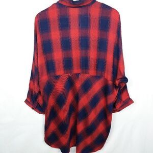 Philosophy plaid,hi-lo, red & navy button down shirt with 3/4 length sleeves.
