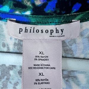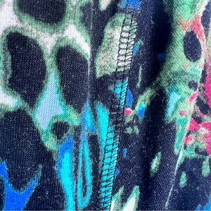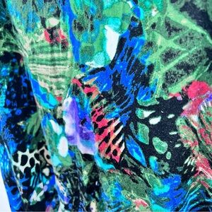 Make a bold statement with this Philosophy Republic Clothing tunic top in the vibrant Amazon Rainforest print. Features a colorful abstract/animal-inspired design with shades of blue, green, purple, and red. The asymmetrical handkerchief hemline adds flow and movement, while the 3/4 ruched sleeves give a flattering touch. Soft and stretchy fabric for ultimate comfort.