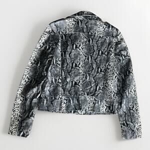 Elevate your look with this Philosophy Republic Clothing faux leather moto jacket in a bold gray and white snakeskin print. Made from high-quality polyurethane with a smooth polyester lining, it combines edgy style with comfort. Perfect for layering over dresses or pairing with jeans and boots for a statement outfit.