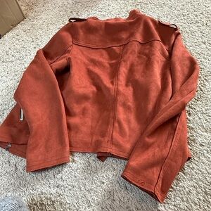 Elegant rust leather jacket by Philosophy. Accented with metallic zippers. Ideal for versatile styling.