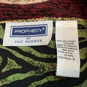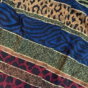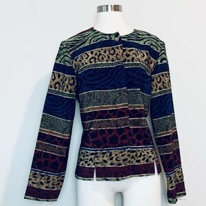 Vintage Sag Harbor black and multicolored patchwork stripe animal print button down lightweight blazer jacket. Long sleeves, hidden buttons except for one ornate top button. Crew neck.
