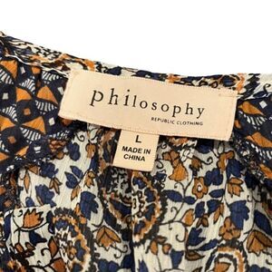 Philosophy Sheer Navy and Gold Tunic Button Front Placket and Paisley Size Large. Pretty contrasting prints. Great condition. See photos for details and measurements. boho, vacation, beach, chiffon, blue and yellow, blue and gold, brunch, dinner