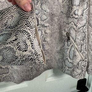 Features a snake skin print all over with a shine to it, comfortable with good stretch, zipper pockets, front zipper closure, lapels for button detail. Preowned.